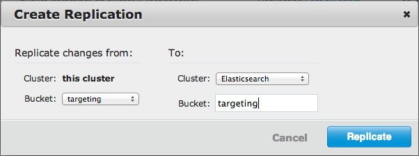 Next we need to setup replication from Couchbase to Elasticsearch. The target bucket in this case is the Elasticsearch index called ’targeting’ which we created a few minutes ago.